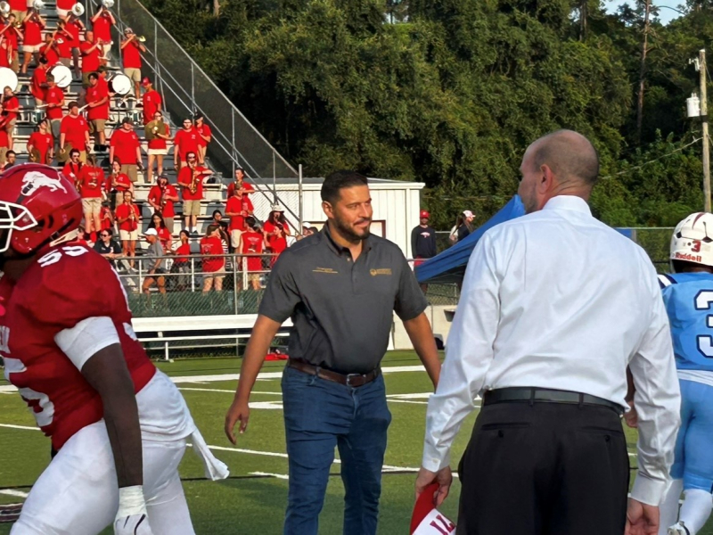 Tallahassee, Fla., August 21, 2025 - Commissioner Kamoutsas joined the community under the Thursday night lights at the Leon vs. Wakulla High School football game. Before kickoff, he had the honor of facilitating the pre-game coin toss, setting the stage for an exciting matchup. The Commissioner was joined by his three daughters, making the evening a special family experience and a chance to enjoy the energy and spirit of the local schools firsthand.